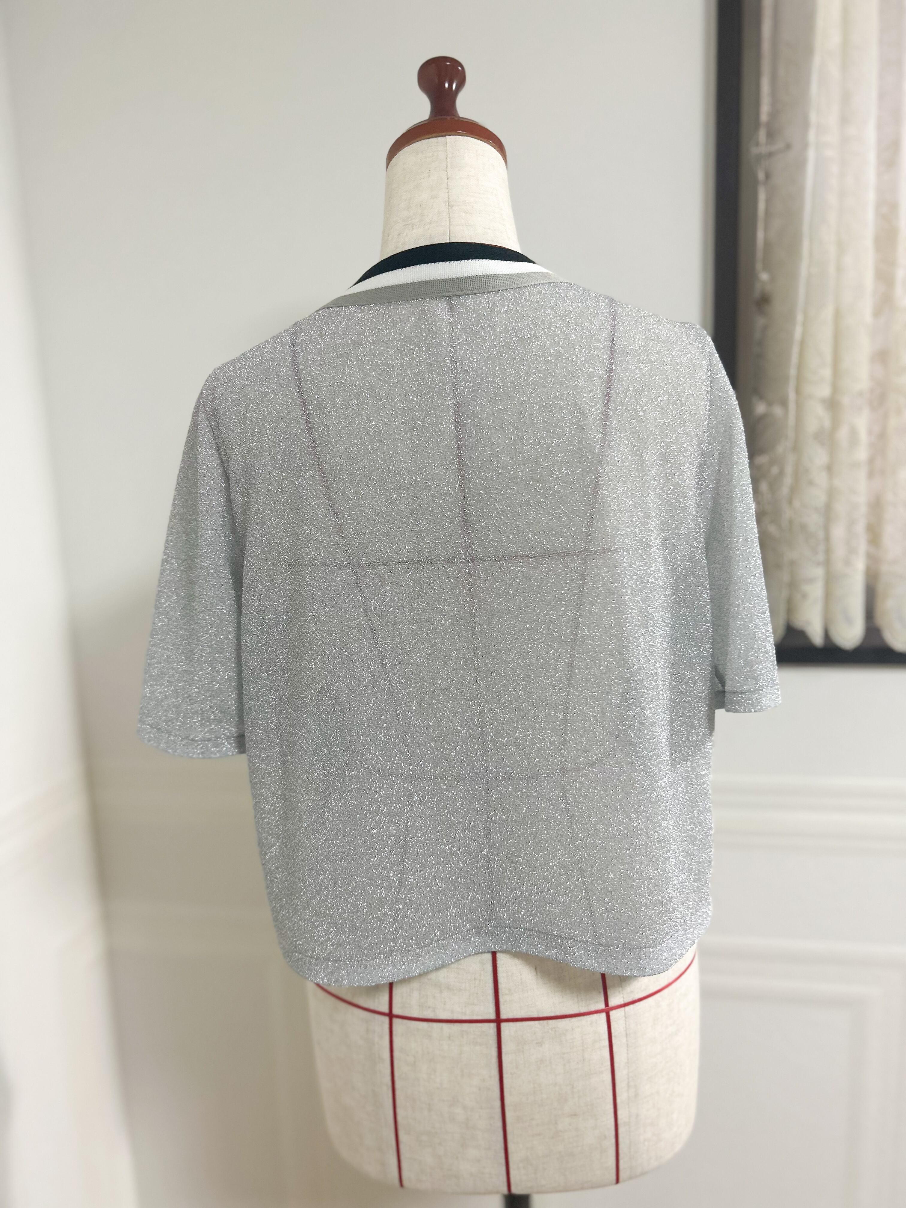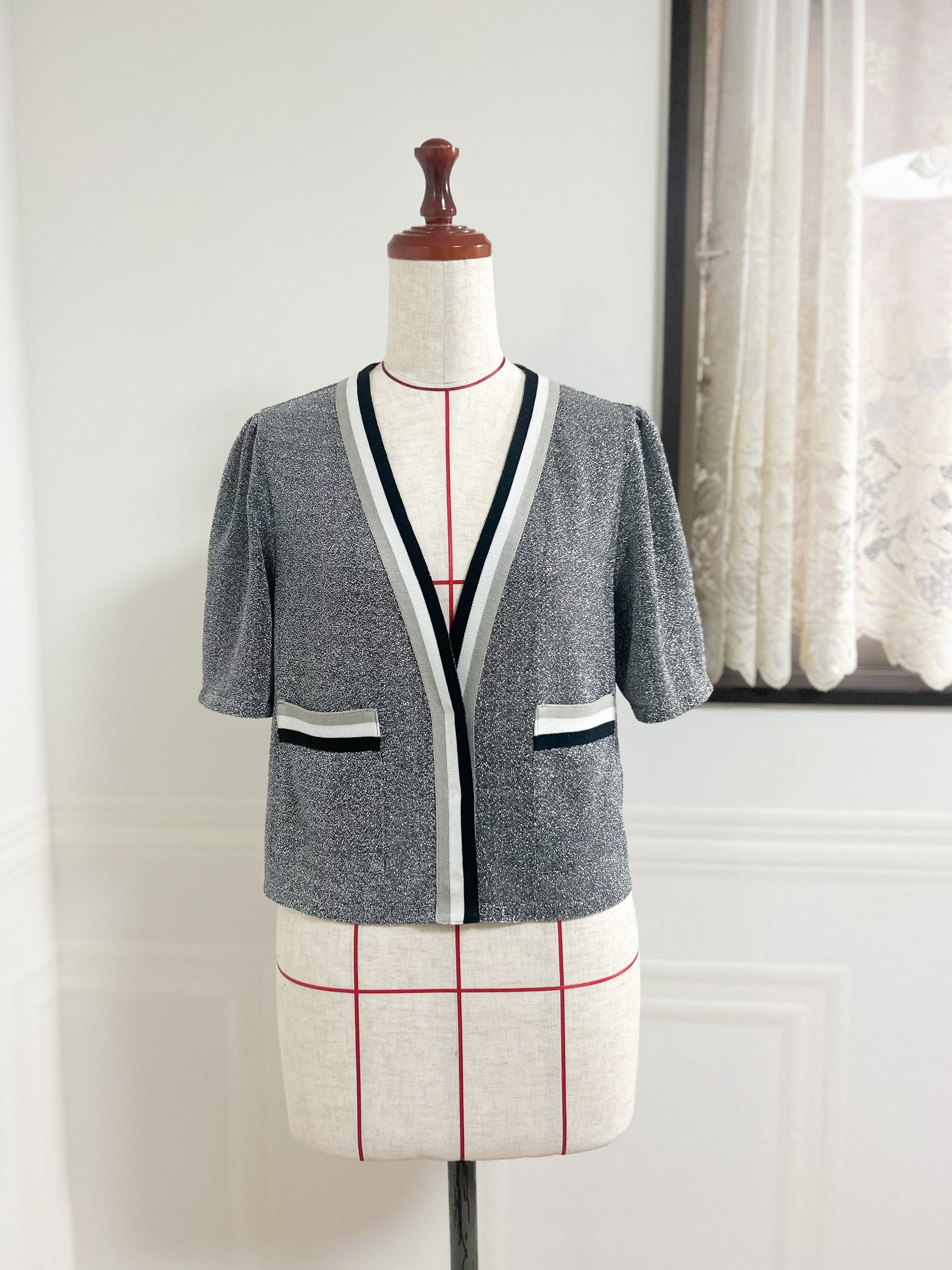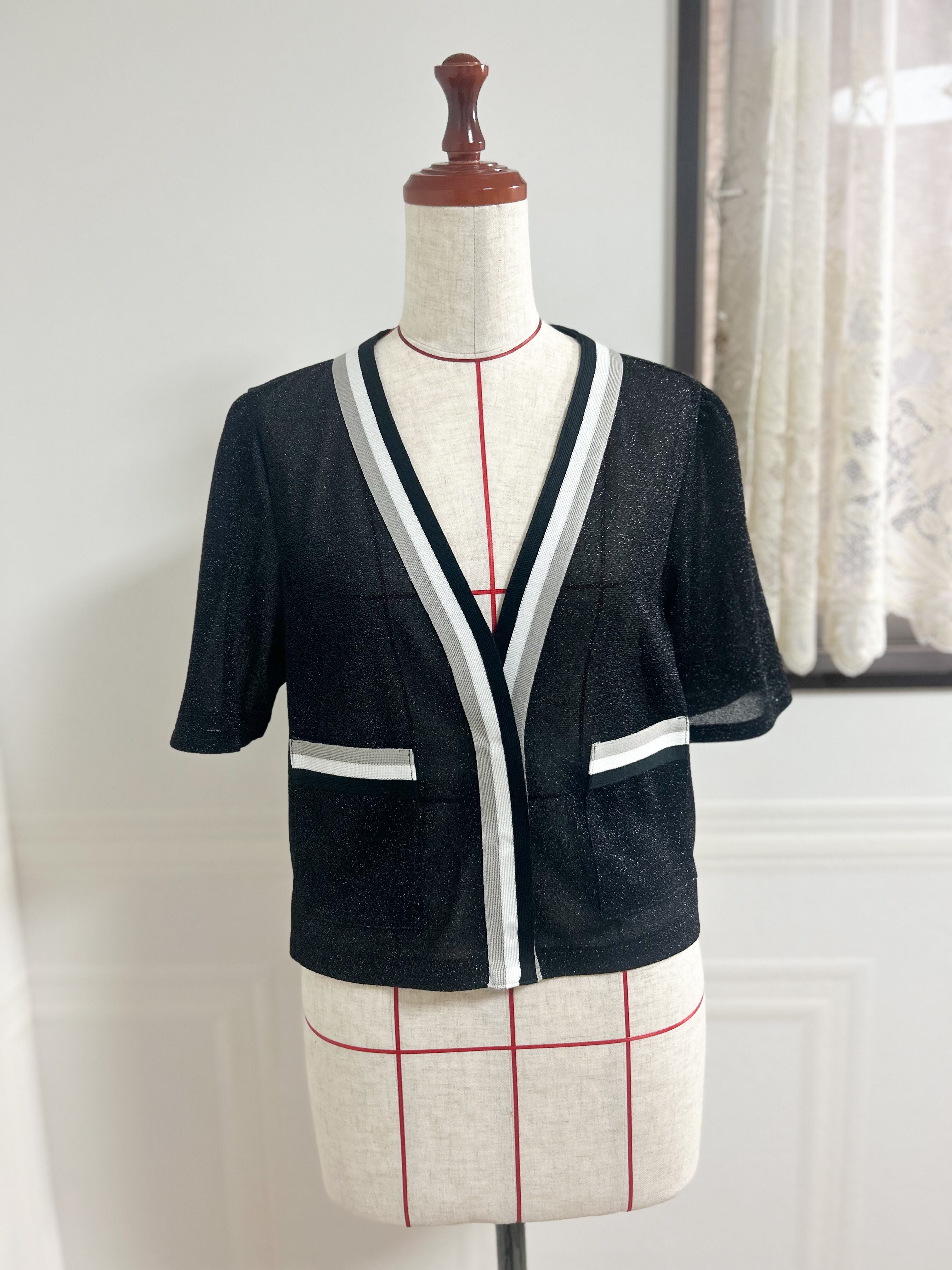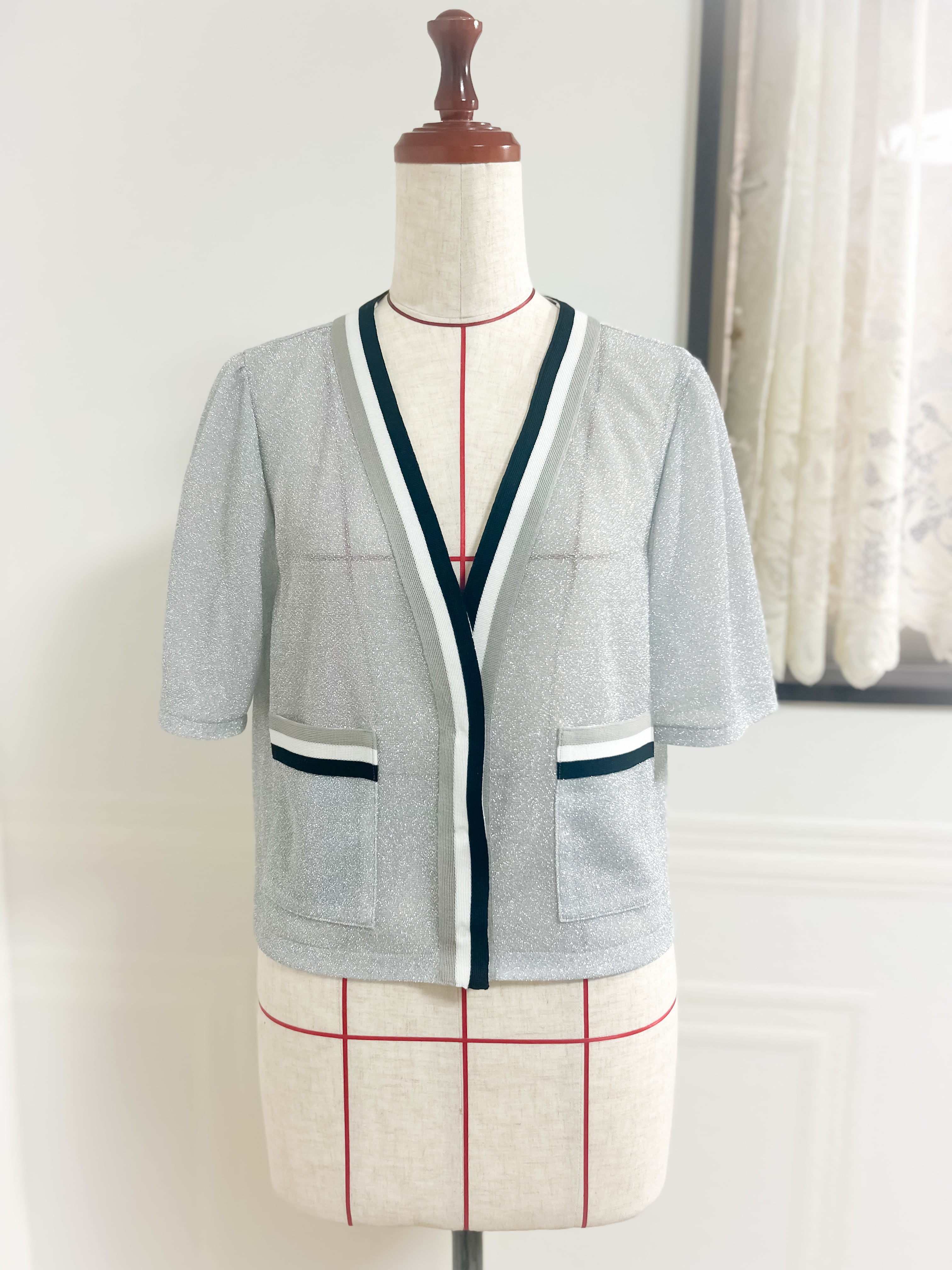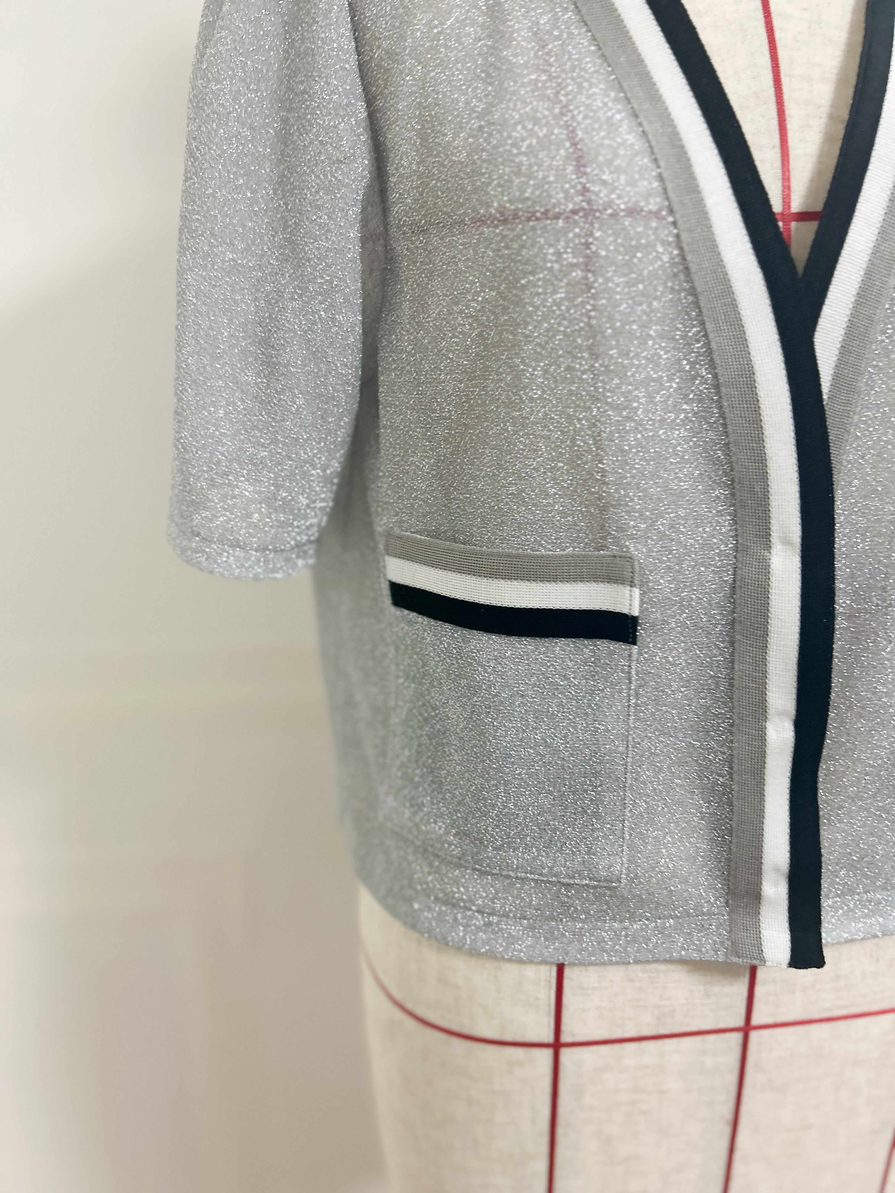 【半袖】シアー シャイニー サマーニットの ラインカーディガン